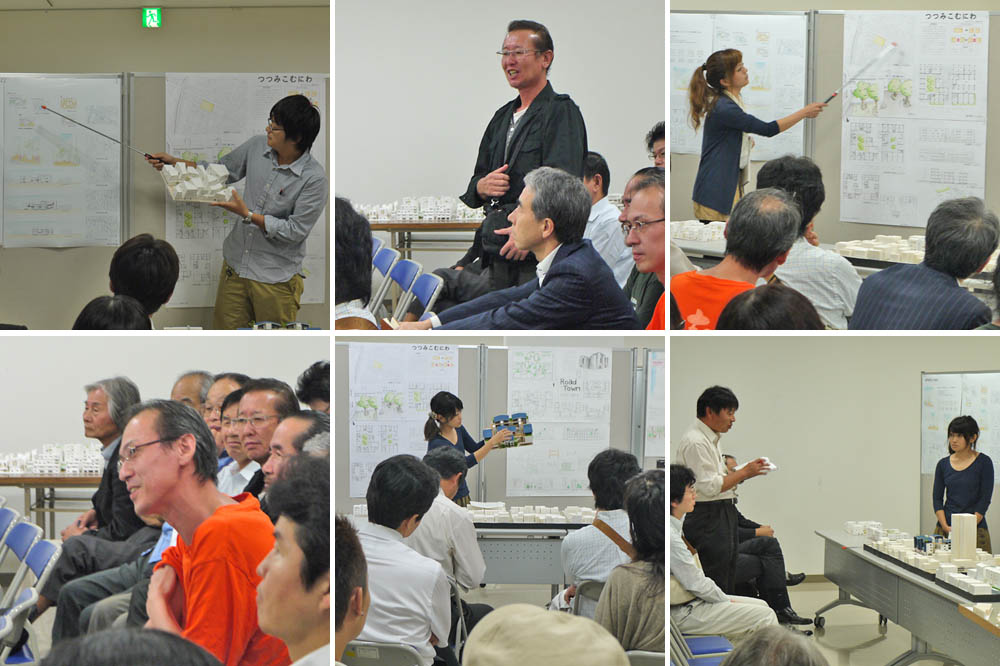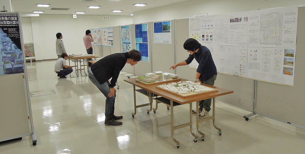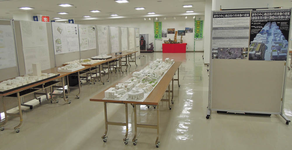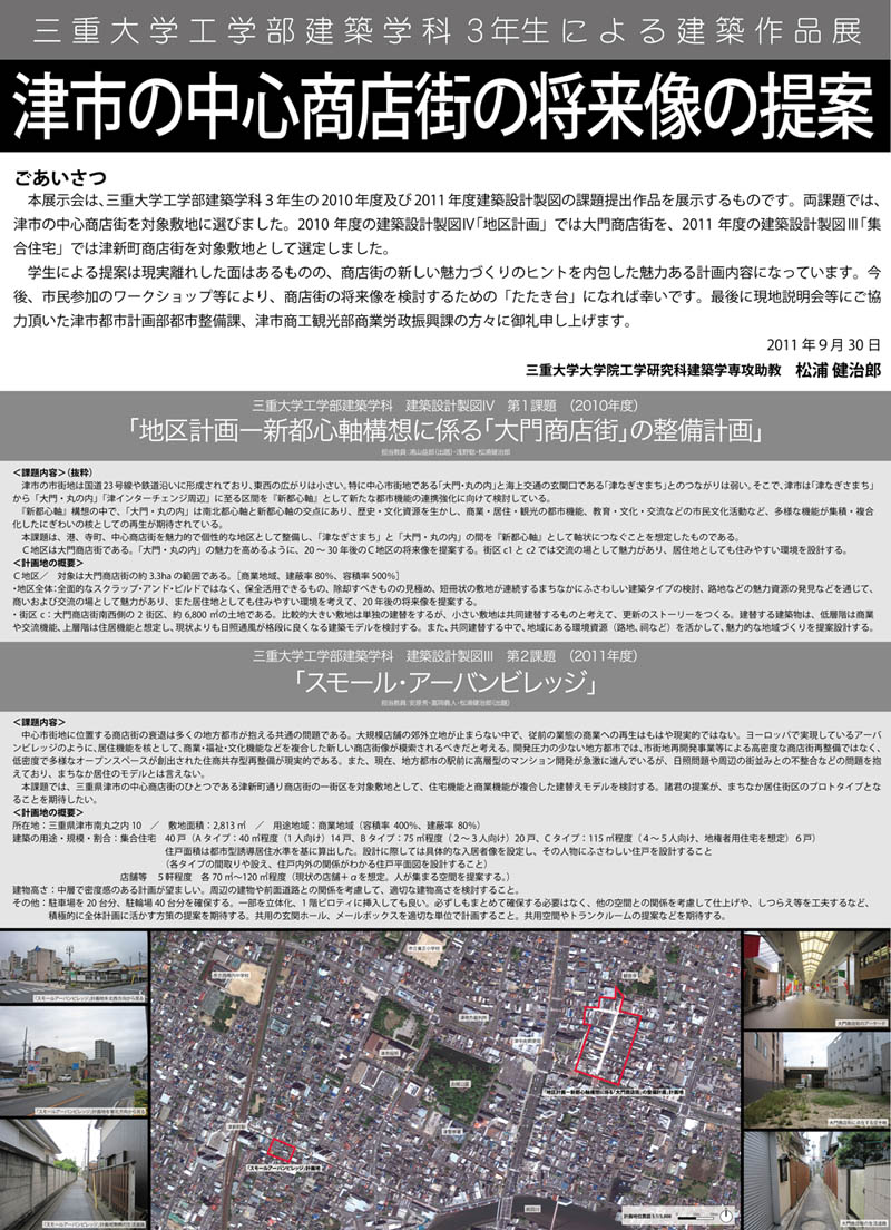 <マスコミ報道> 「中心商店街の将来像の提案 三重大学工学部建築学科の作品展」(見出し抜粋) 「未来の商店街 三重大生提案 津新町通り・大門大通り きょうから津で建築作品展 西洋風や迷路空間も」(見出し抜粋) 「”まち作り”模型展」NHK(ホットイーブニング三重)2011.9.30 「新たな商店街の姿 三重大生が発信 津で建築作品展 住む人や福祉の観点取り入れ 優秀作で発表会も」(見出し抜粋) 「建築作品展:津商店街の将来像、三重大の学生がデザイン」(見出し抜粋) 「三重大建築学科学生が自由な発想で提案 津市中心商店街の将来像」(見出し抜粋) |