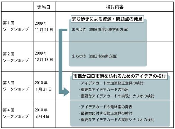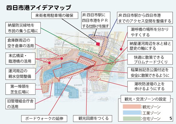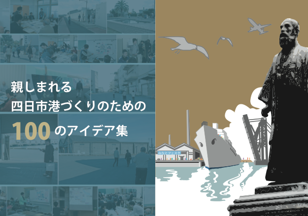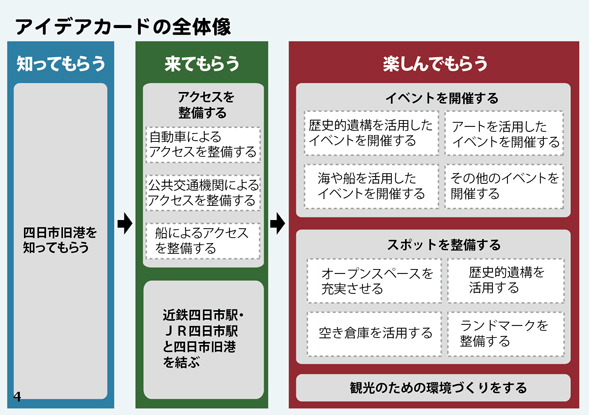 2009年度のワークショップでは、まち歩きを踏まえて、親しまれる四日市港づくりのためのさまざまなアイデアを検討し、最終的に100のアイデアをカード形式として取りまとめました。アイデアの構成は大きく「知ってもらう」、「来てもらう」、「楽しんでもらう」の3つに分けられます。場所が特定できるアイデアはアイデアマップに整理されました。「知ってもらう」では、四日市港をPRするための様々なアイデアが17枚にまとめられました。「来てもらう」の16枚は、「アクセスを整備する」と「近鉄四日市駅やJR四日市駅と四日市旧港を結ぶ」の2つに分けられました。「楽しんでもらう」の67枚は、「イベントを開催する」・「スポットを整備する」・「観光のための環境づくりをする」の3つに分けられました。