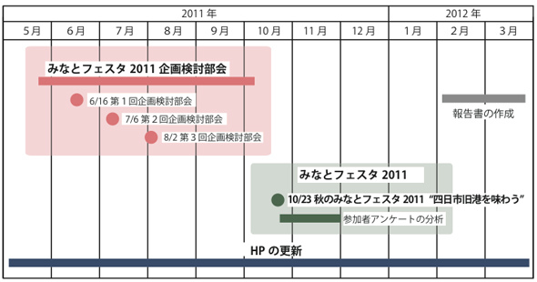 本年度の活動内容は大きく3つに分かれます。第1に、みなとフェスタ 2011 企画検討部会の 活動です。第2に、みなとフェスタ 2011 の開催と参加者アンケート調査です。第3に、 活動内容を情報発信するためのホームぺージ゙管理です。