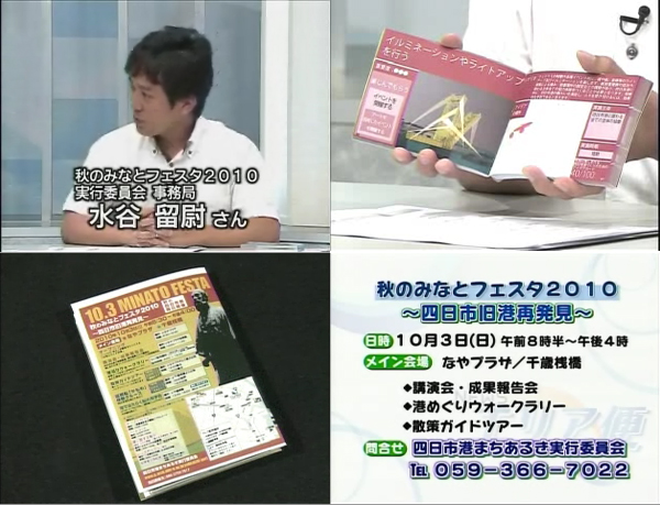 「四日市港の表情多彩に 公募写真を再展示」(見出し抜粋) 「四日市旧港魅力を発信みなとフェスタ」(見出し抜粋) 「四日市でフェスタ」(見出し抜粋) 「秋のみなとフェスタ」 「野外音楽や食、アート」(見出し抜粋) 「散策マップ手に港の良さ感じて 四日市で23日みなとフェスタ」(見出し抜粋) 「港の魅力写真コンテスト 四日市港まちあるき実行委 文化財、 海、船やそこで働く人々 12 日まで作品募集」(見出し抜粋) 「四日市港の魅力写真コン まちあるき実行委 作品を募集」(見出し抜粋) 「四日市港の写真を募る「みなとフェスタ」に合わせ」(見出し抜粋) 「四日市港の写真を募集 みなとフェスタで展示」(見出し抜粋) 四日市みなと講座 プレイベント」 「四日市旧港の見所マップが完成」(見出し抜粋) 「四日市旧港周辺を紹介 まち歩きマップ製作 公共施設や駅で無料配布」(見出し抜粋) 「旧四日市港の史跡紹介 まち歩きマップ作成 立ち寄り飲食店も掲載」(見出し抜粋) 「四日市港の歴史を歩こう まち歩き実行委 駅などでマップ配布」(見出し抜粋) 「旧港巡りのお供に 四日市 まち歩きマップ一新」(見出し抜粋) 「みなと再発見!」 「産業、消費者の港に 四日市でみなとまちづくりフォーラム」(見出し抜粋) 「港の魅力を再発見 まちづくり考える 四日市でフォーラム」(見出し抜粋) 「秋のみなとフェスタ2010」 「旧港の歴史 再発見 四日市でフェスタ 散策ツアーなど楽しむ」(見出し抜粋) 「四日市港旧港 風情を満喫 フェスタで親子ら散策」(見出し抜粋) 「秋のみなとフェスタ2010」 「四日市で来月3日「みなとフェスタ」散策の楽しさアピール」(見出し抜粋) 「旧港巡りの名先導ー四日市散策マップ作成中ー歩きやすさや歴史紹介に知恵」(見出し抜粋) 「親しまれる四日市港づくり」 「親しまれる四日市港づくり」 「親しまれる四日市港づくりワークショップ」